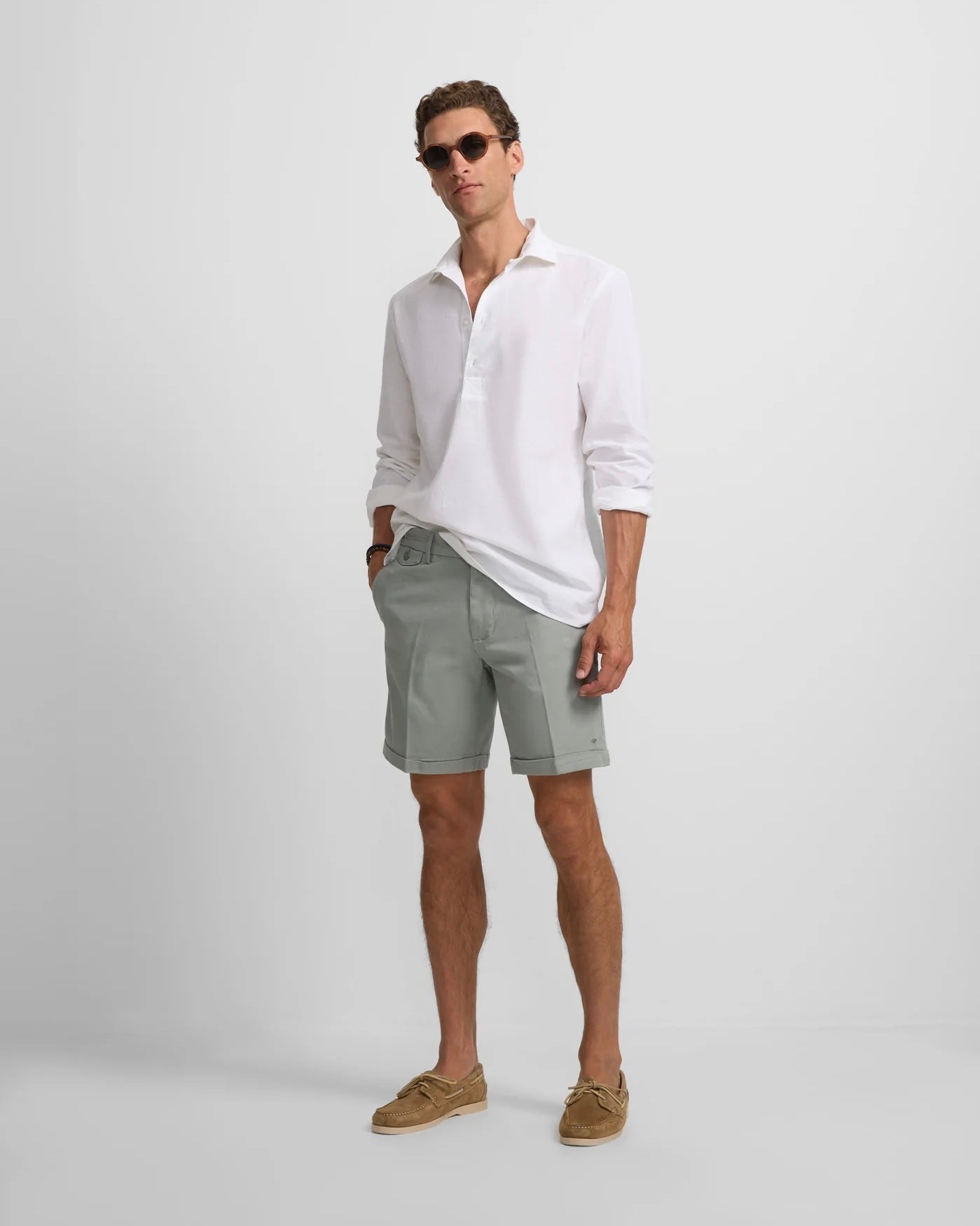 Bermuda clásica confeccionada en mezcla de algodón BCI de corte Regular fit. Presenta cierre con botón personalizado y cremallera, trabillas en cintura y bolsillos delanteros y traseros de vivo. Cuenta con detalle de raquetas bordadas delanteras y traseras. Contiene bajo con vuelta.